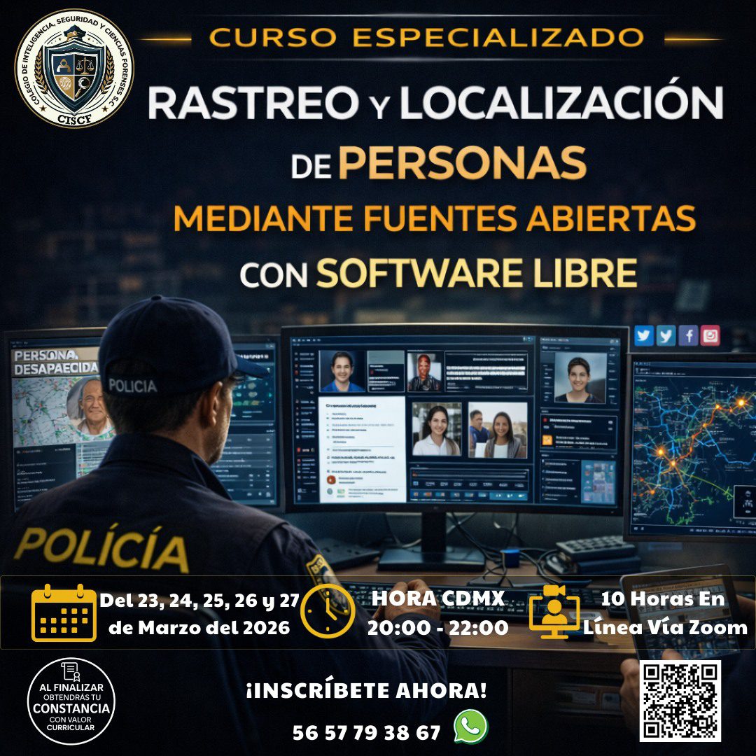 Este curso especializado tiene un enfoque teórico–demostrativo, orientado al rastreo y localización de personas mediante fuentes abiertas (OSINT) y el uso profesional de software libre. Durante las sesiones, el docente proyectará en tiempo real el uso de herramientas como Maltego CE, SpiderFoot, theHarvester y Shodan, permitiendo que las y los participantes observen paso a paso la aplicación práctica de técnicas de búsqueda, correlación y análisis de información pública, así como la integración de datos en casos de investigación digital e inteligencia.