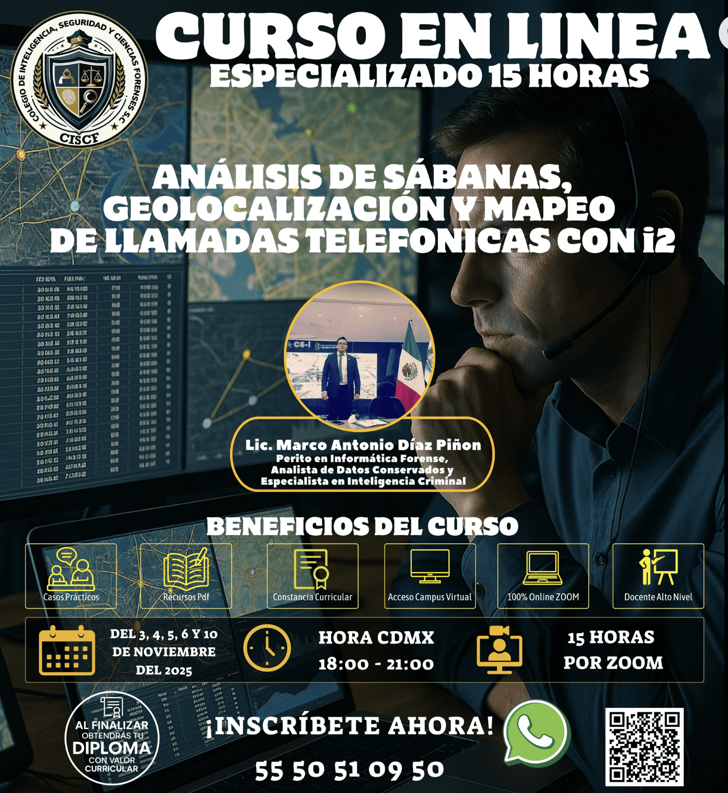 Este curso especializado tiene un enfoque teórico–demostrativo para el análisis de sábanas de llamadas telefónicas, técnicas de geolocalización y el uso profesional de i2 Analyst’s Notebook. Durante las sesiones, el profesor proyectará en su pantalla el uso real del software i2, de modo que los alumnos podrán observar paso a paso cómo se aplican las herramientas y metodologías en casos de análisis de telecomunicaciones e inteligencia criminal.