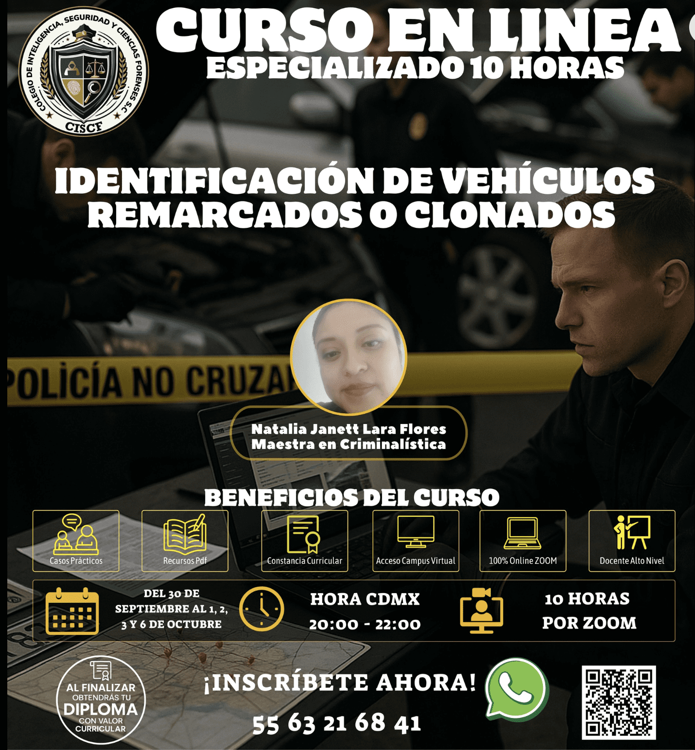 El incremento de vehículos clonados o con números de serie remarcados representa un grave problema en la seguridad pública y la investigación criminal. Este curso intensivo de 10 horas (5 sesiones de 2 horas) te brindará conocimientos técnicos para identificar alteraciones en números de serie, reconocer señales de manipulación y aplicar protocolos de verificación confiables.
