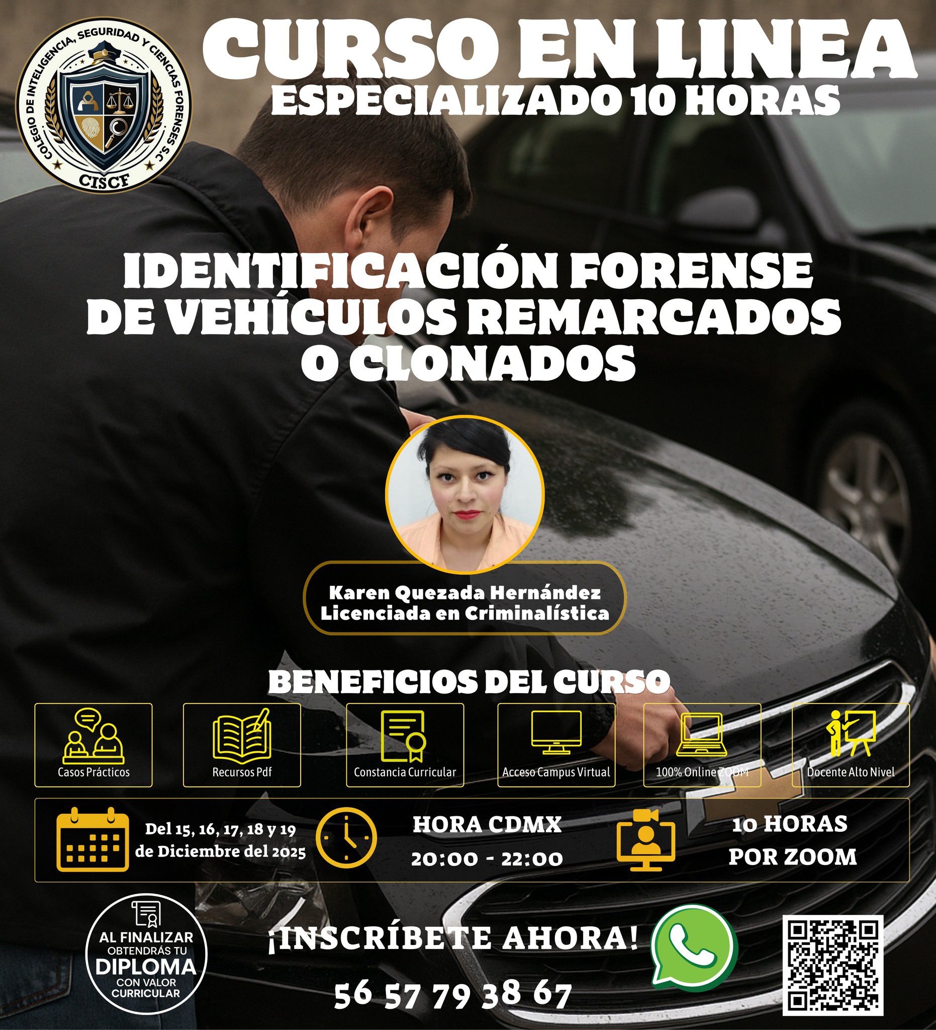 El incremento de vehículos clonados o con números de serie remarcados representa un grave problema en la seguridad pública y la investigación criminal. Este curso intensivo de 10 horas (5 sesiones de 2 horas) te brindará conocimientos técnicos para identificar alteraciones en números de serie, reconocer señales de manipulación y aplicar protocolos de verificación confiables.