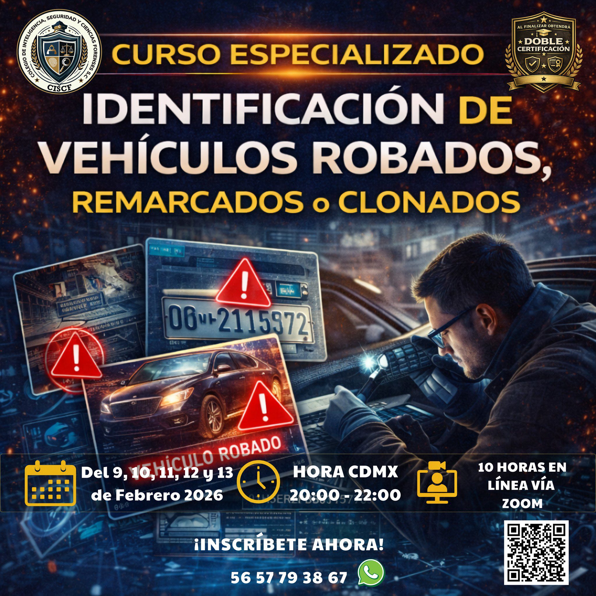 El incremento de vehículos clonados o con números de serie remarcados representa un grave problema en la seguridad pública y la investigación criminal. Este curso intensivo de 10 horas (5 sesiones de 2 horas) te brindará conocimientos técnicos para identificar alteraciones en números de serie, reconocer señales de manipulación y aplicar protocolos de verificación confiables.