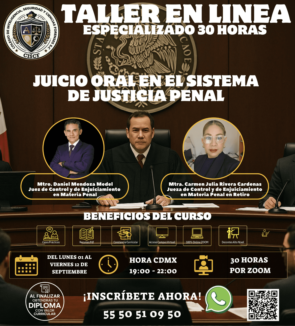 Este curso especializado tiene como finalidad brindar una formación integral y práctica sobre el Juicio Oral en el Sistema de Justicia Penal Acusatorio, con un enfoque profesional desde la perspectiva de jueces expertos en la materia. A lo largo de 30 horas distribuidas en 10 sesiones, los participantes comprenderán la dinámica procesal, las técnicas de litigación oral, la valoración de pruebas y la emisión de sentencias.
