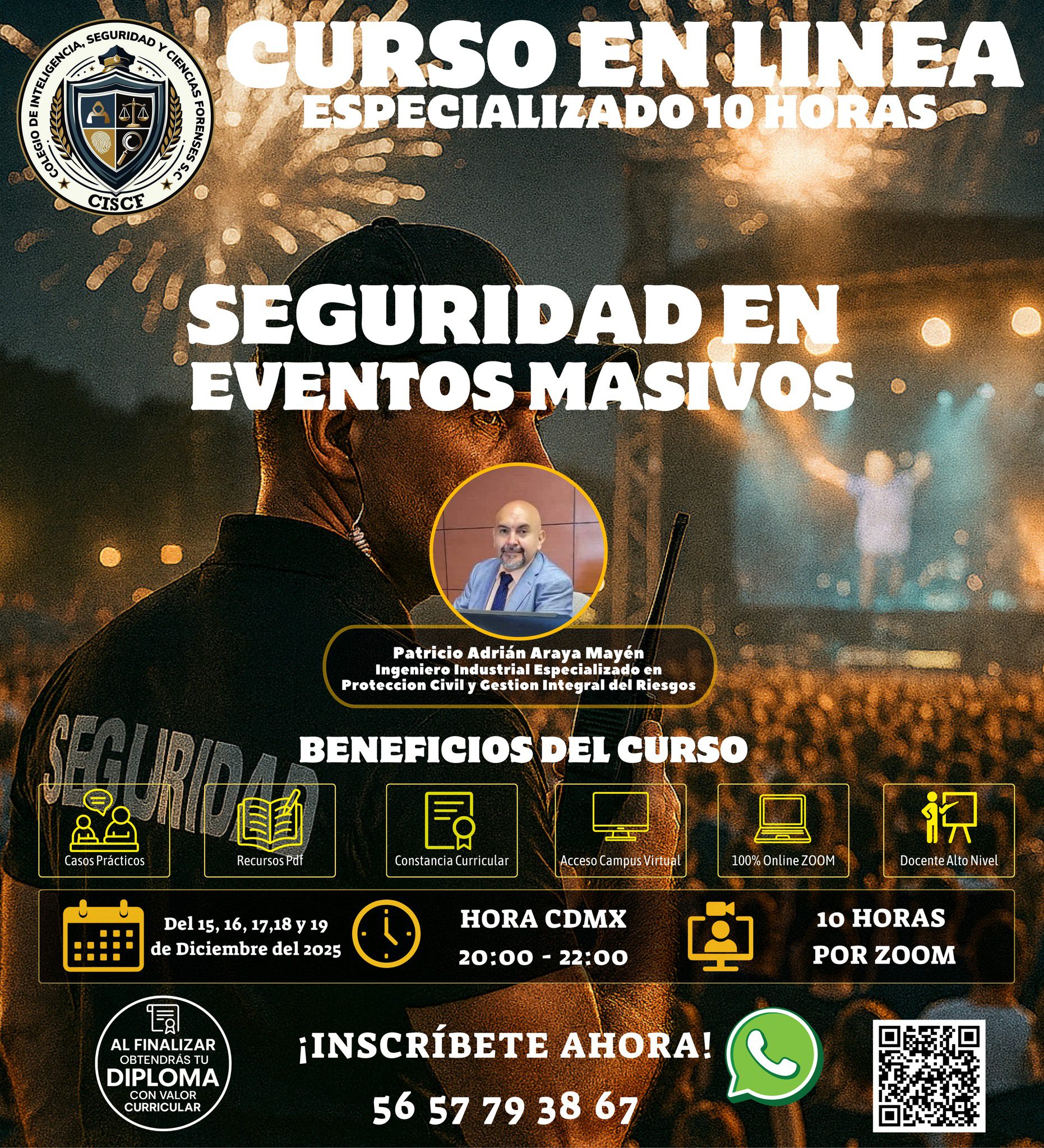 Las concentraciones masivas representan escenarios complejos donde el riesgo puede escalar en segundos. Este curso intensivo de 10 horas (5 sesiones de 2 horas) te enseñará protocolos, normativas, estrategias operativas y respuestas tácticas utilizadas por los profesionales encargados de garantizar la seguridad en conciertos, festivales, estadios, ferias y eventos de alto aforo.