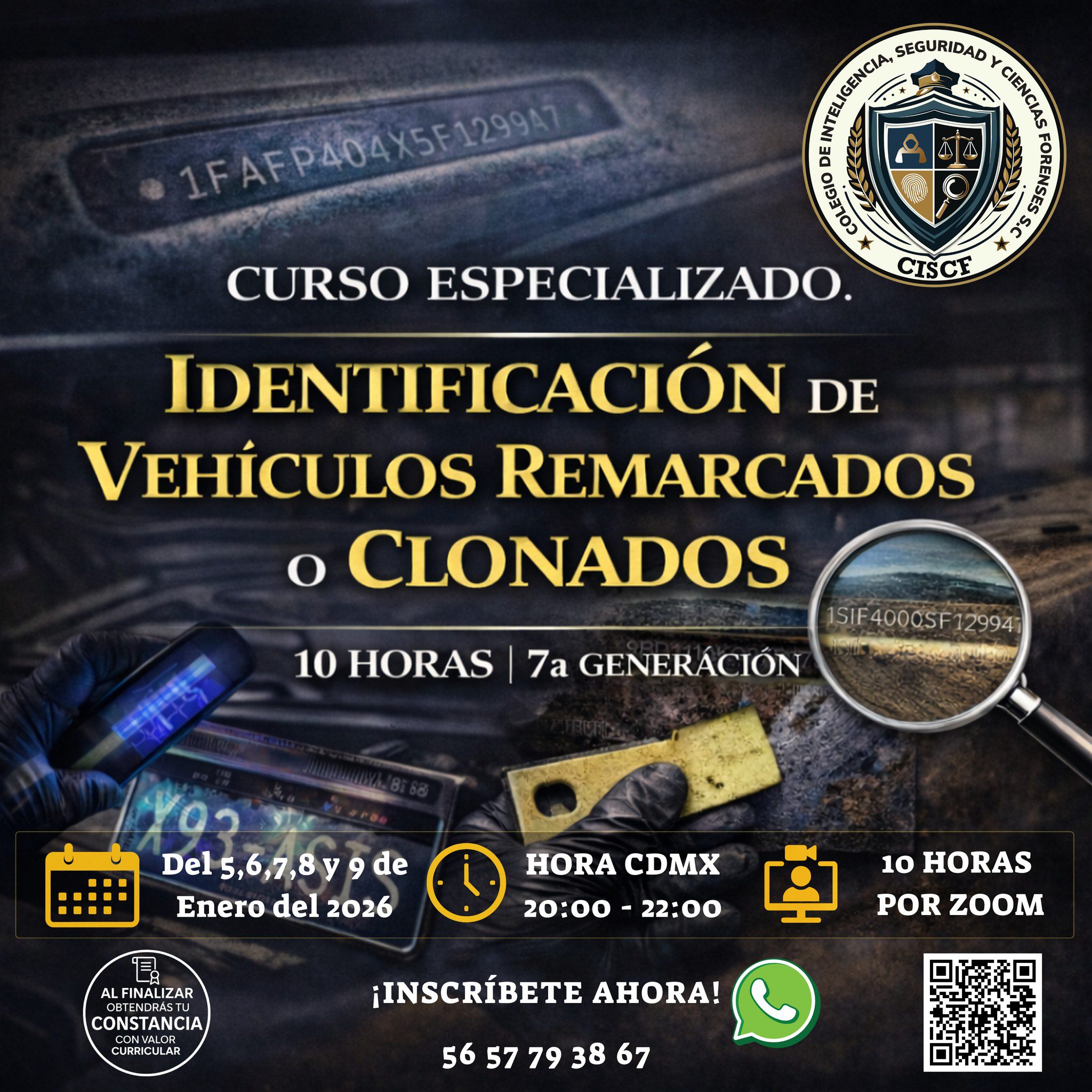 El incremento de vehículos clonados o con números de serie remarcados representa un grave problema en la seguridad pública y la investigación criminal. Este curso intensivo de 10 horas (5 sesiones de 2 horas) te brindará conocimientos técnicos para identificar alteraciones en números de serie, reconocer señales de manipulación y aplicar protocolos de verificación confiables.
