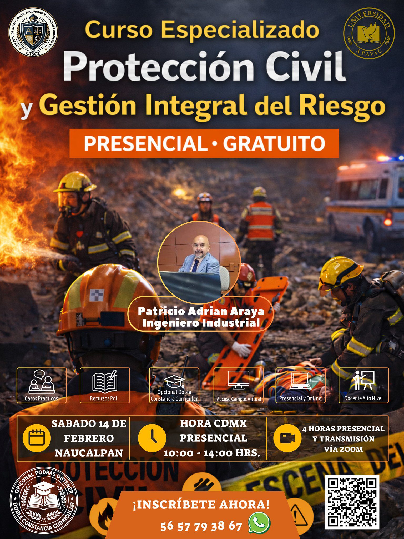 Este curso presencial de Protección Civil y Gestión Integral del Riesgo proporciona conocimientos teóricos y prácticos para la prevención, preparación, respuesta y recuperación ante emergencias, desastres naturales y situaciones de alto riesgo, bajo lineamientos nacionales e internacionales.