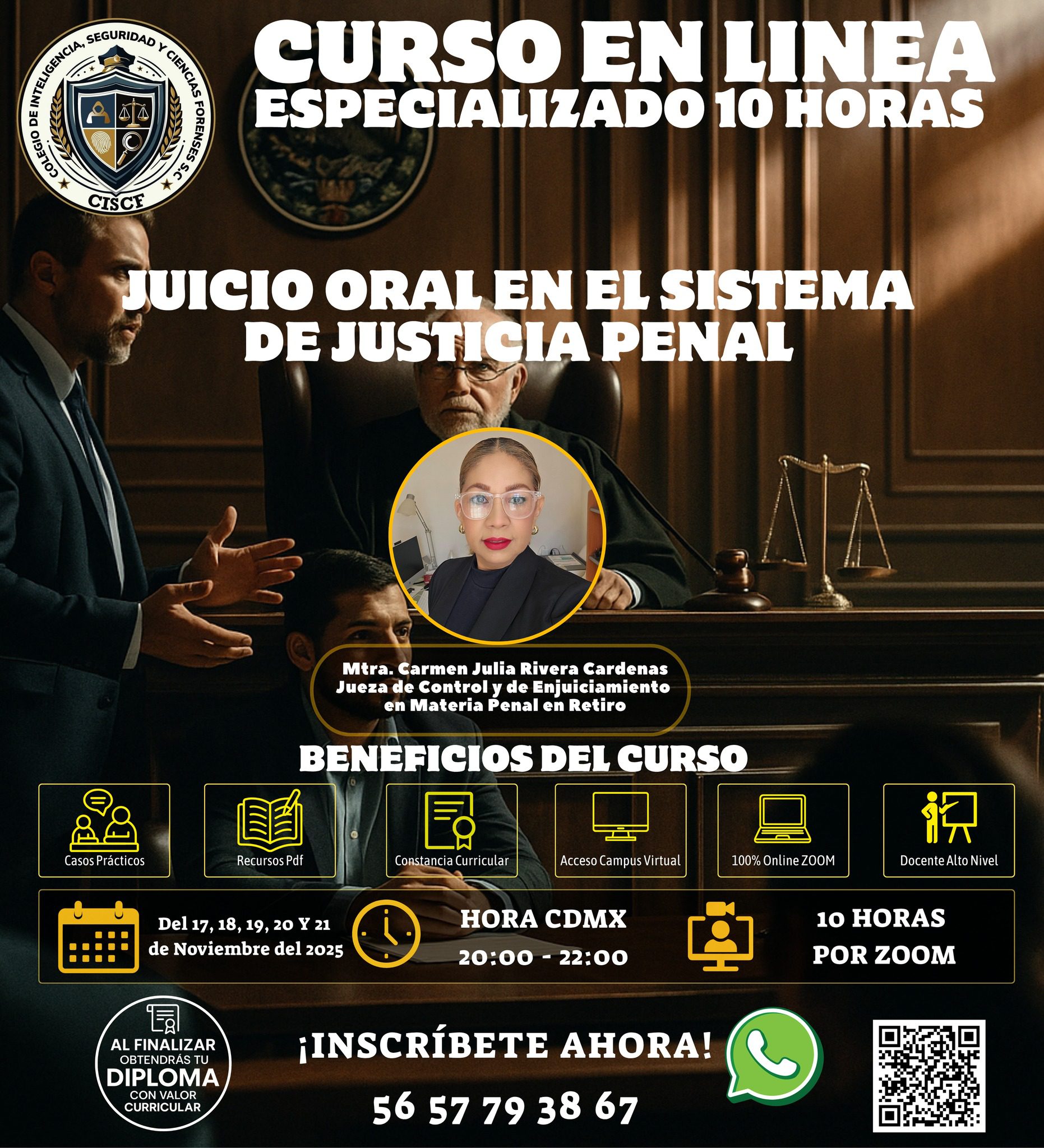 Este curso especializado de 10 horas (5 sesiones de 2 horas) está diseñado para que estudiantes y profesionales del derecho dominen el sistema penal acusatorio mediante el análisis de audiencias, roles procesales y estrategias de litigación en juicios orales.
