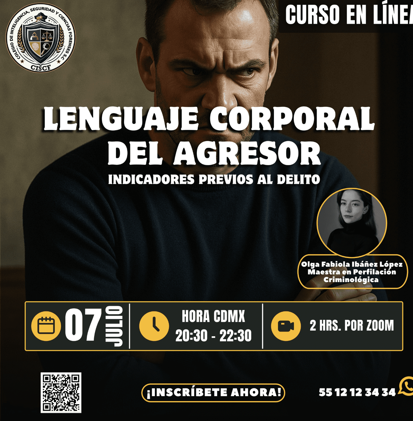 Este curso analiza el comportamiento no verbal del agresor antes de cometer un delito, y cómo interpretar señales de riesgo a través de expresiones faciales, gestos, posturas y movimientos involuntarios. Es una herramienta crucial en la prevención del delito y la detección de conductas violentas.