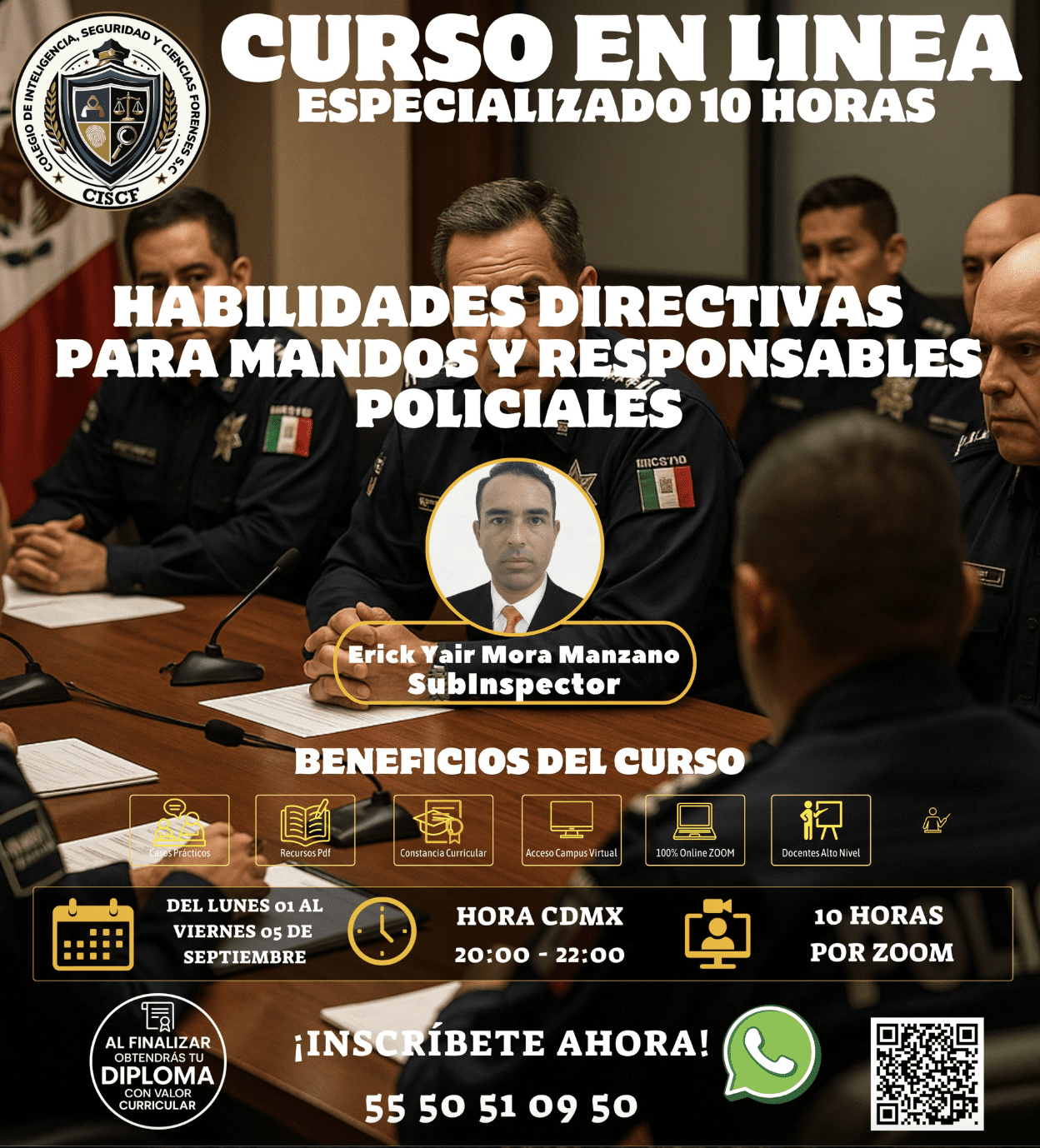 Este curso especializado de 10 horas (5 sesiones de 2 horas) está diseñado para fortalecer las competencias directivas de mandos y responsables policiales, mejorando la toma de decisiones, el liderazgo operativo y la gestión estratégica en contextos de seguridad.