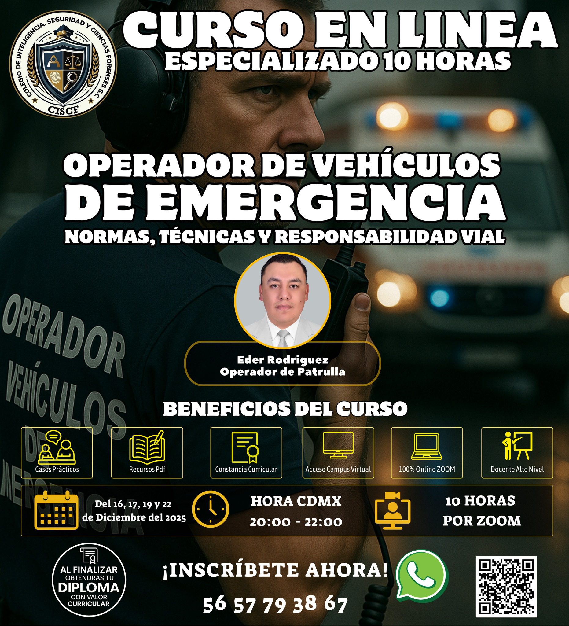 Este curso especializado de 10 horas (5 sesiones de 2 horas) brinda las herramientas esenciales para operar vehículos de emergencia de forma segura, eficiente y responsable, cumpliendo con las normas técnicas y legales aplicables. Se abordarán aspectos preventivos, éticos y operativos indispensables para el personal que conduce ambulancias, patrullas, camiones de bomberos o unidades de rescate.
